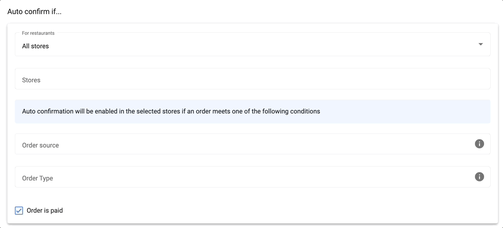 Następnie wybierz typy zamówień — Dostawa lub Na wynos w polu Typ Zamówienia, lub pozostaw puste, aby automatycznie potwierdzać zamówienia dowolnego typu.