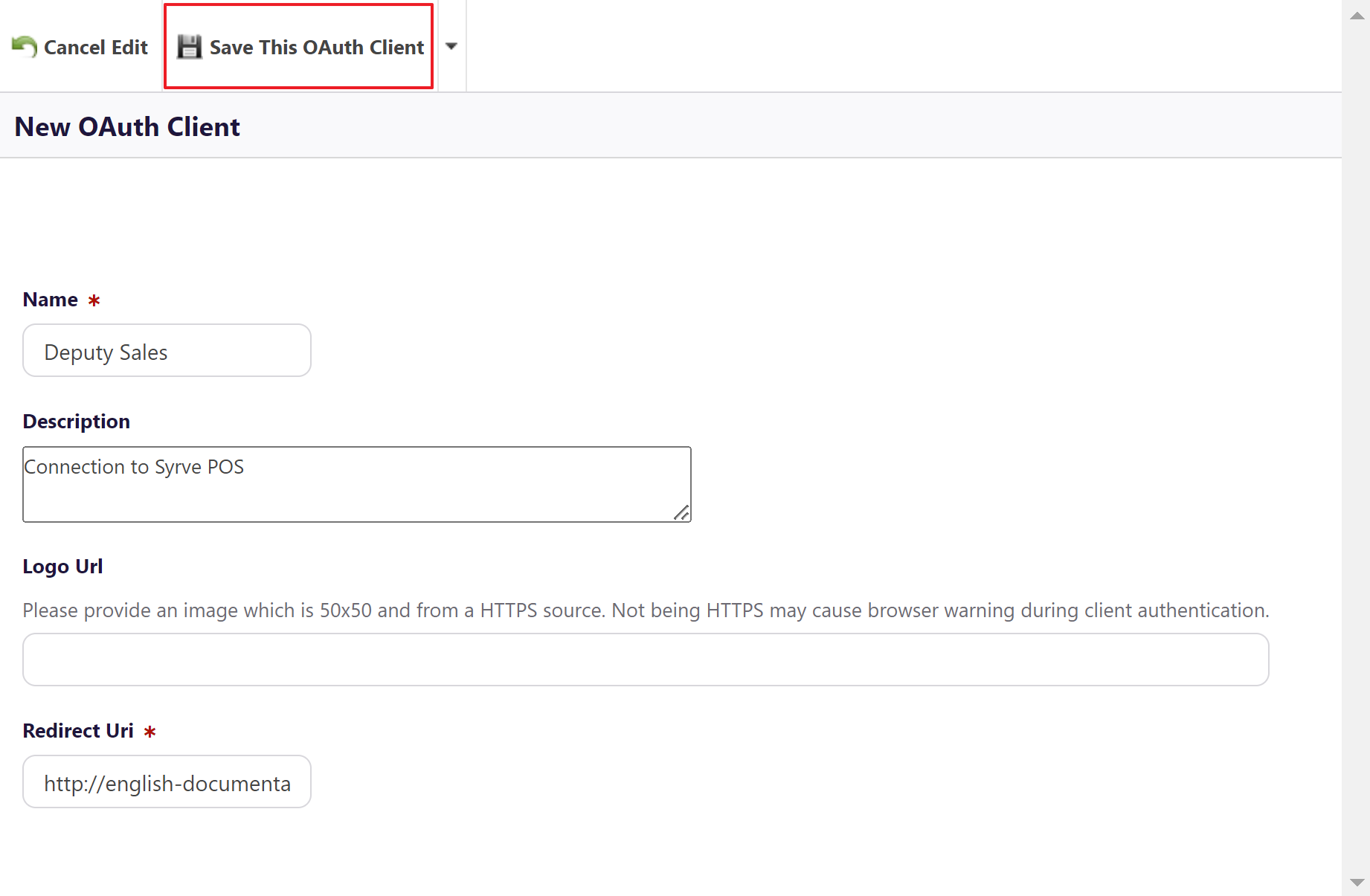 Wypełnij formularz. Wklej link opisany w poprzednim rozdziale w polu Redirect Uri i kliknij Zapisz tego klienta OAuth.