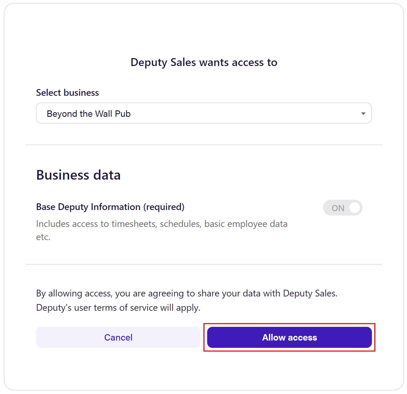 Pojawi się okno, w którym musisz podać swoje dane logowania do Deputy i kliknąć Zaloguj się. Następnie wybierz swoją firmę w Deputy i kliknij Zezwól na dostęp.