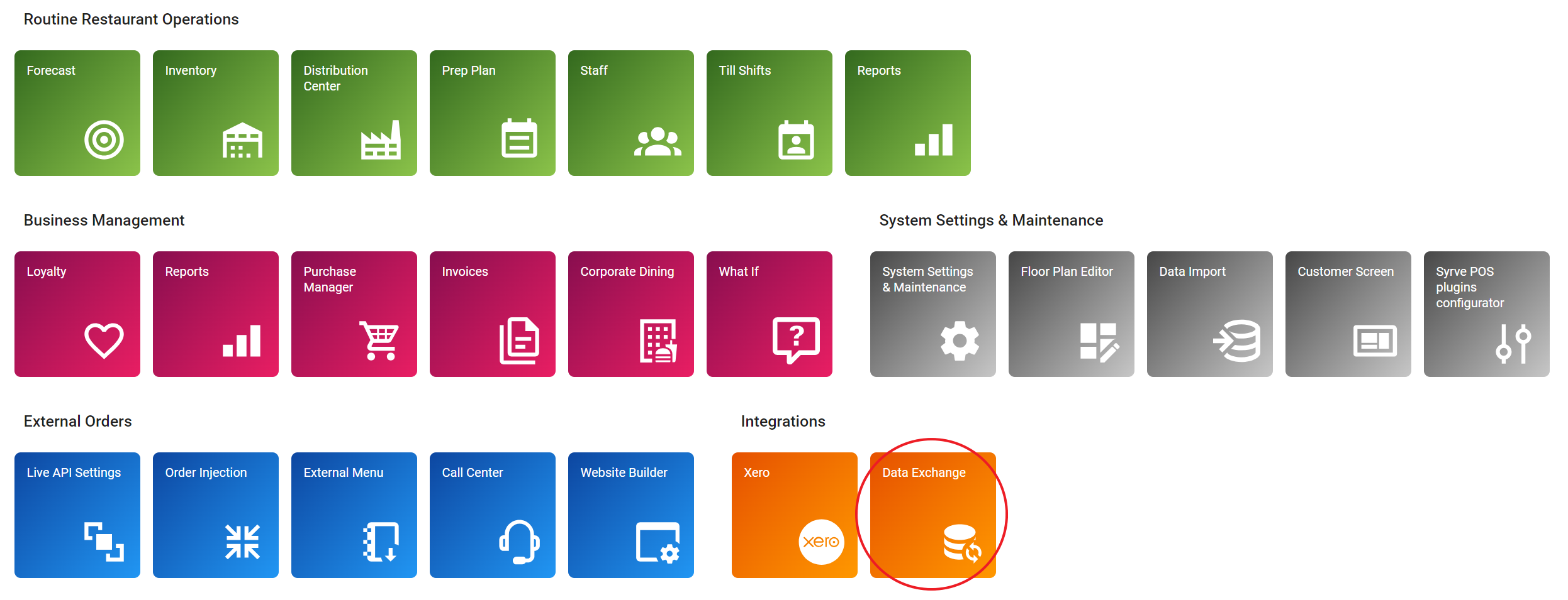 Aplikacja Wymiana Danych znajdująca się w sekcji Integracje na stronie głównej aplikacji Syrve została zaprojektowana do eksportowania zarówno danych sprzedażowych, jak i niesprzedażowych z Syrve do zewnętrznych systemów business intelligence, księgowości oraz innych systemów zarządzania zasobami i planowania, a także do importowania danych z tych systemów.