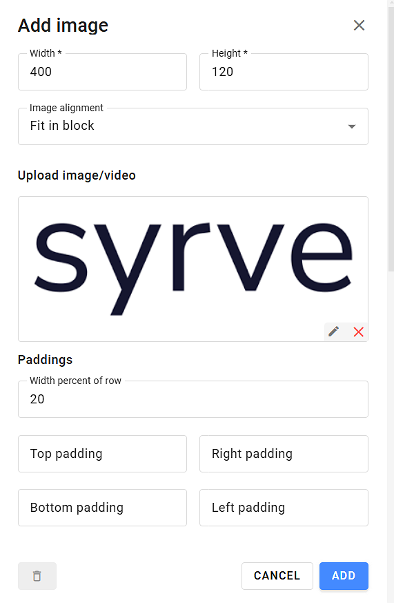 W oknie popup wpisz szerokość i wysokość obrazu, wybierz wyrównanie i załaduj obraz. W razie potrzeby dodaj marginesy.