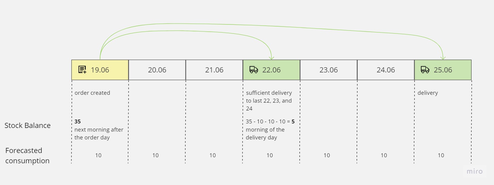 Ilość zamówienia = szacowane zużycie w dniach 22/06 + 23/06 + 24/06 – stan magazynowy na poranek dnia dostawy = 10 + 10 + 10 – 5 = 25.