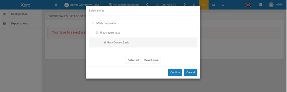 Aby wybrać sklep, kliknij tam, gdzie jest napisane 'No store Selected' w niebieskim pasku. Możesz wybrać wszystkie sklepy lub konkretny sklep do eksportu do Xero.