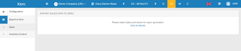 'D' (Dzień), 'W' (Tydzień) oraz 'M' (Miesiąc) są dostępne jako predefiniowane okresy eksportu na górze ekranu w niebieskim pasku, możesz także wybrać ‘C’, aby ustawić niestandardowy okres eksportu.