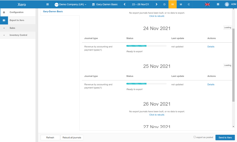 Aby utworzyć dzienniki w Xero jako zaksięgowane, upewnij się, że opcja Export as posted na dole po prawej stronie ekranu jest zaznaczona.Następnie naciśnij przycisk Send to Xero, aby wyeksportować wszystkie zbudowane dzienniki za wybrany okres.