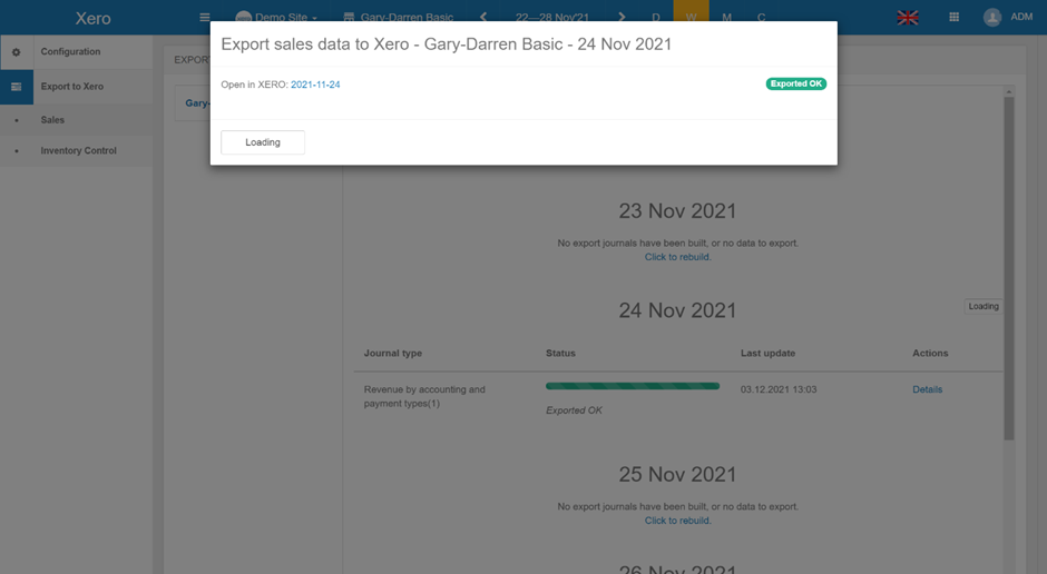 Jeśli eksportujesz jako szkic, po naciśnięciu Details obok dziennika zobaczysz link do dziennika w Xero. Naciśnij Loading, aby przejść do Xero i kontynuować przetwarzanie danych tam.