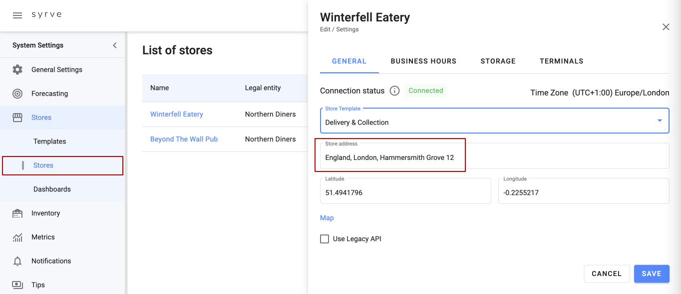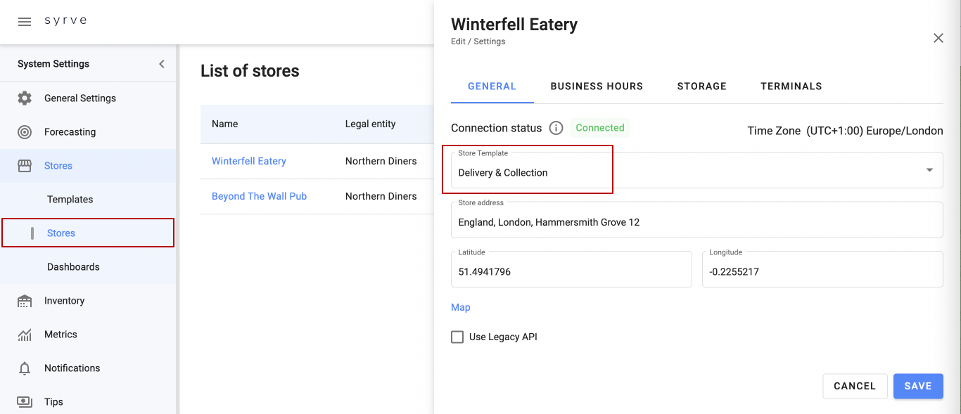 Jeśli korzystasz z Syrve Loyalty API dla swojej usługi dostawy, przejdź do zakładki Właściwości sklepu w ustawieniach sklepu, włącz opcję Use Legacy API i wybierz Terminal dostawy.