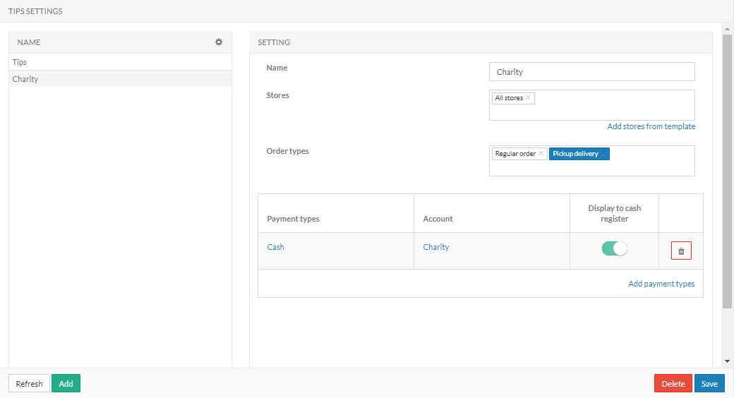 W Syrve mamy kilka trybów obsługi: Zamówienie standardowe, Dostawa lub Odbiór. Załóżmy, że realizujesz dostawy, ale napiwki nie są skonfigurowane dla tego typu zamówienia lub są rejestrowane na innych kontach. W takim przypadku musisz wykonać dodatkowe ustawienia.