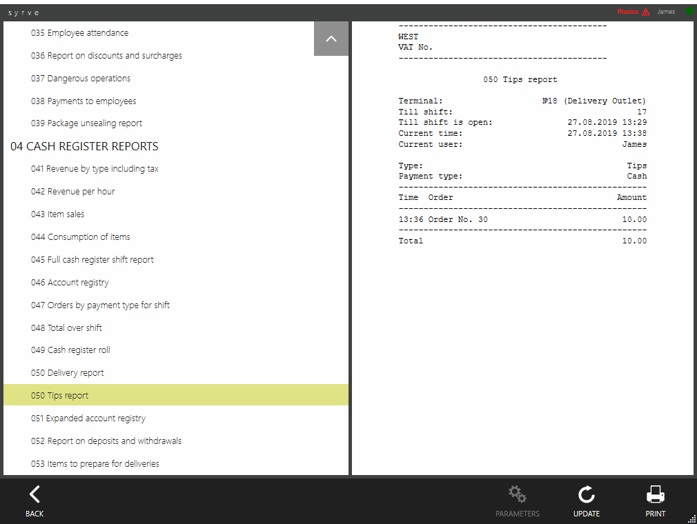 Możesz poznać łączną kwotę napiwków i datków charytatywnych dokonanych podczas bieżącej zmiany z raportu napiwków. Przejdź do > Raporty > 04 Raporty kasy.