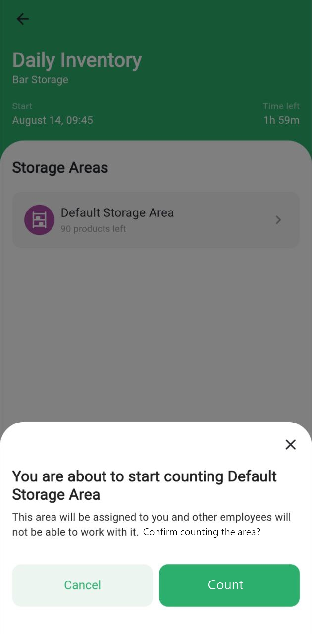 Pojawi się komunikat potwierdzający rozpoczęcie pracy z wybranym obszarem magazynowym. Stuknij Liczenie, aby kontynuować, lub Anuluj, aby wybrać inny obszar.