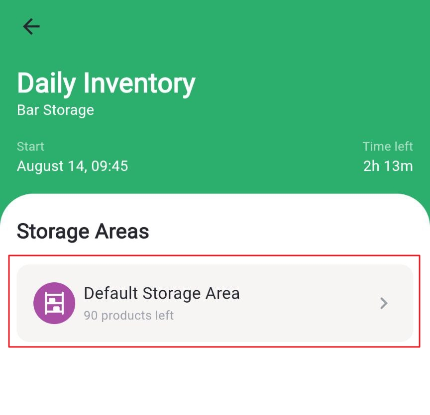 Jeśli w aplikacji Syrve skonfigurowano obszary magazynowe, a inwentaryzacja obejmuje produkty z różnych obszarów, aplikacja wyświetli okno z dostępnymi obszarami magazynowymi przed rozpoczęciem. Jeśli nie skonfigurowano obszarów magazynowych, wyświetlony zostanie tylko jeden obszar. Stuknij nazwę obszaru magazynowego, aby rozpocząć.