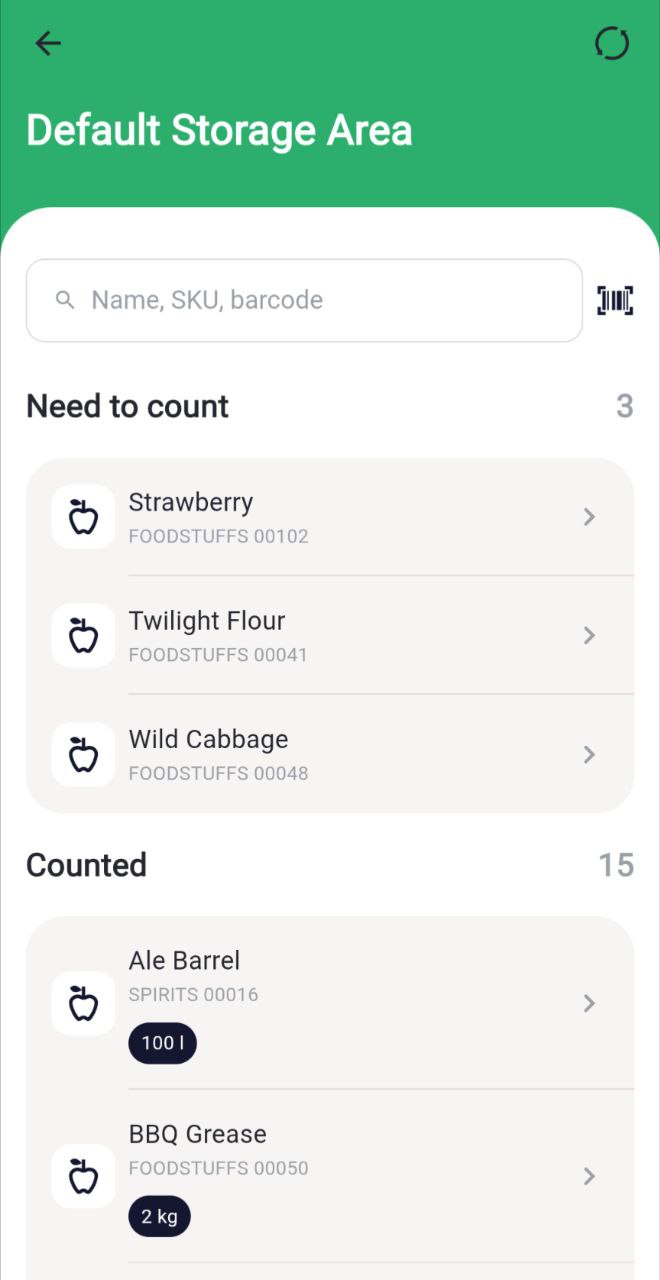 Po wejściu do obszaru magazynowego ekran wyświetli listę produktów w bieżącej inwentaryzacji dla tego obszaru. Możesz liczyć zapasy na kilka sposobów: