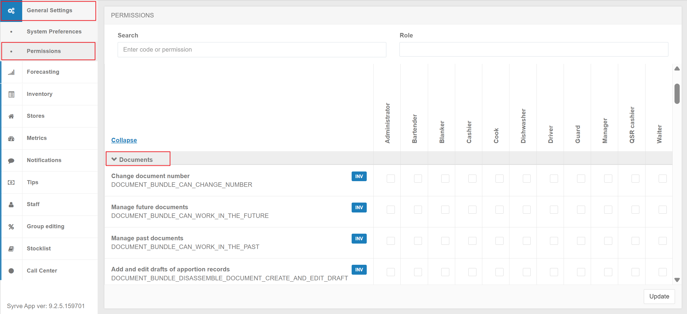 Przed rozpoczęciem pracy z dokumentami inwentaryzacyjnymi upewnij się, że Twoi pracownicy mają wymagane uprawnienia oraz że zostały dokonane odpowiednie ustawienia dokumentów. Niektóre ustawienia zarządzane są w aplikacji Syrve, podczas gdy inne obsługiwane są w Syrve Office.