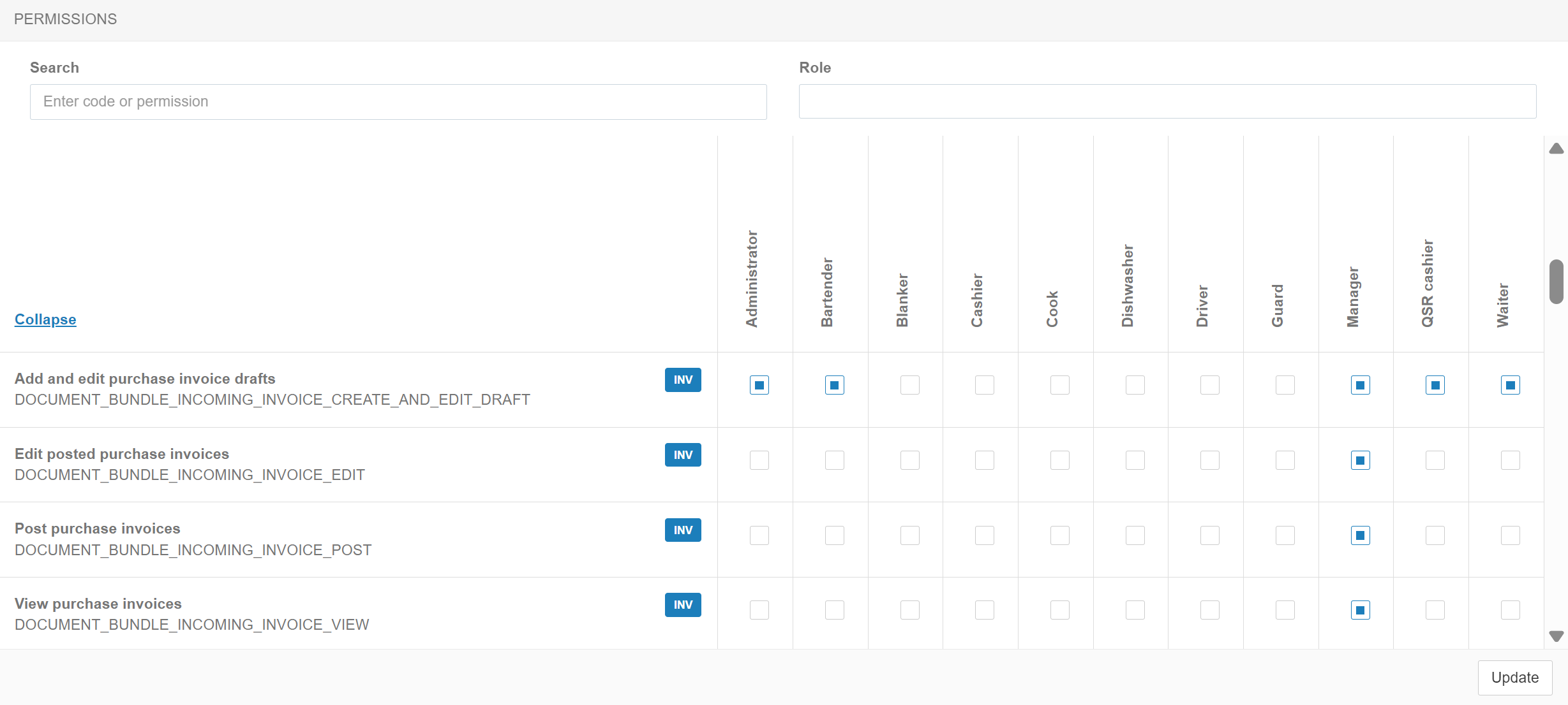 Aby przypisać uprawnienia, zaznacz pola tam, gdzie typy dokumentów przecinają się z rolami użytkowników, a następnie kliknij Aktualizuj. Poniżej pokazano przykładową konfigurację dla Faktur zakupu.