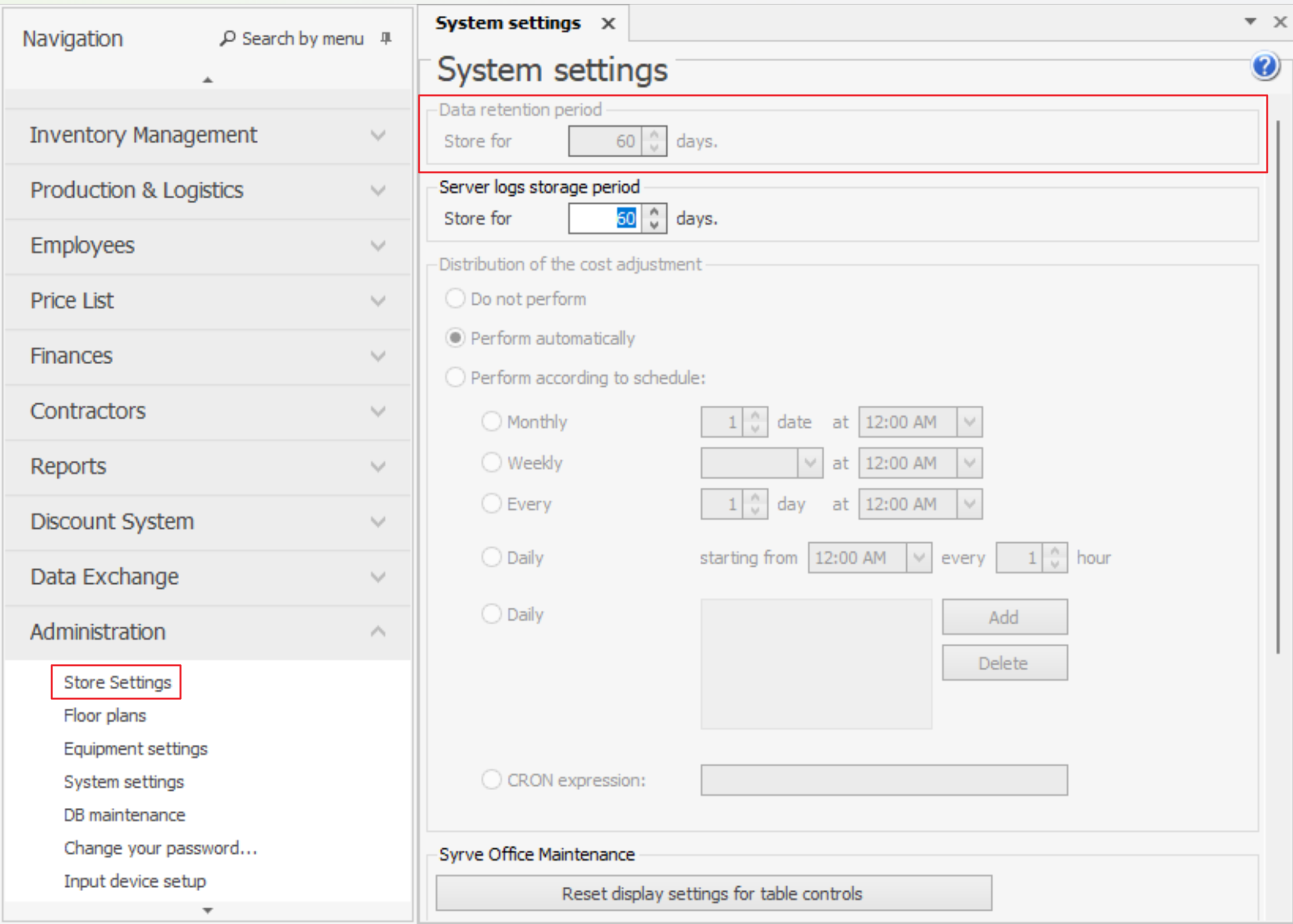 Okres przechowywania danych. Skonfiguruj w Administracja > Ustawienia systemu. Podczas tworzenia lub edycji dokumentu można wybrać tylko datę mieszczącą się w okresie przechowywania (bieżąca data minus okres przechowywania). Starsze dokumenty są dostępne tylko do podglądu.