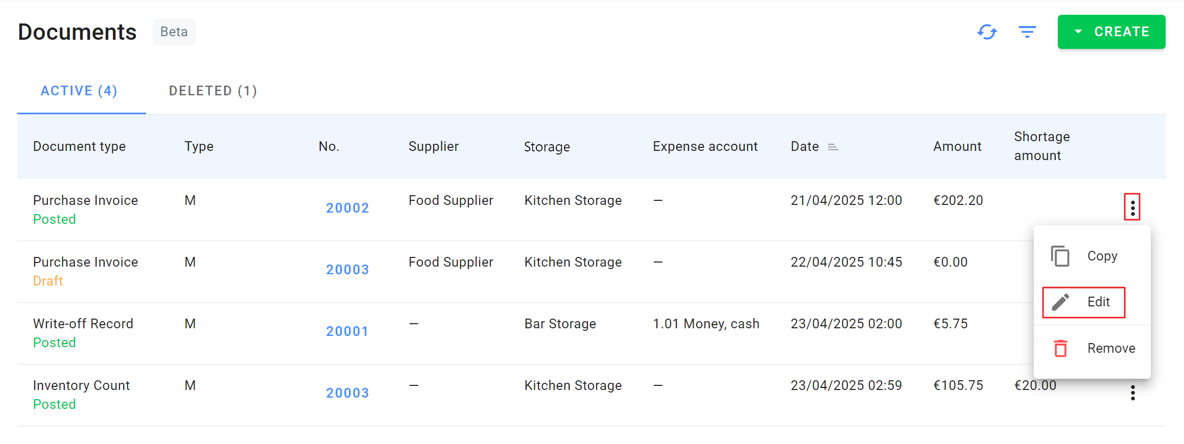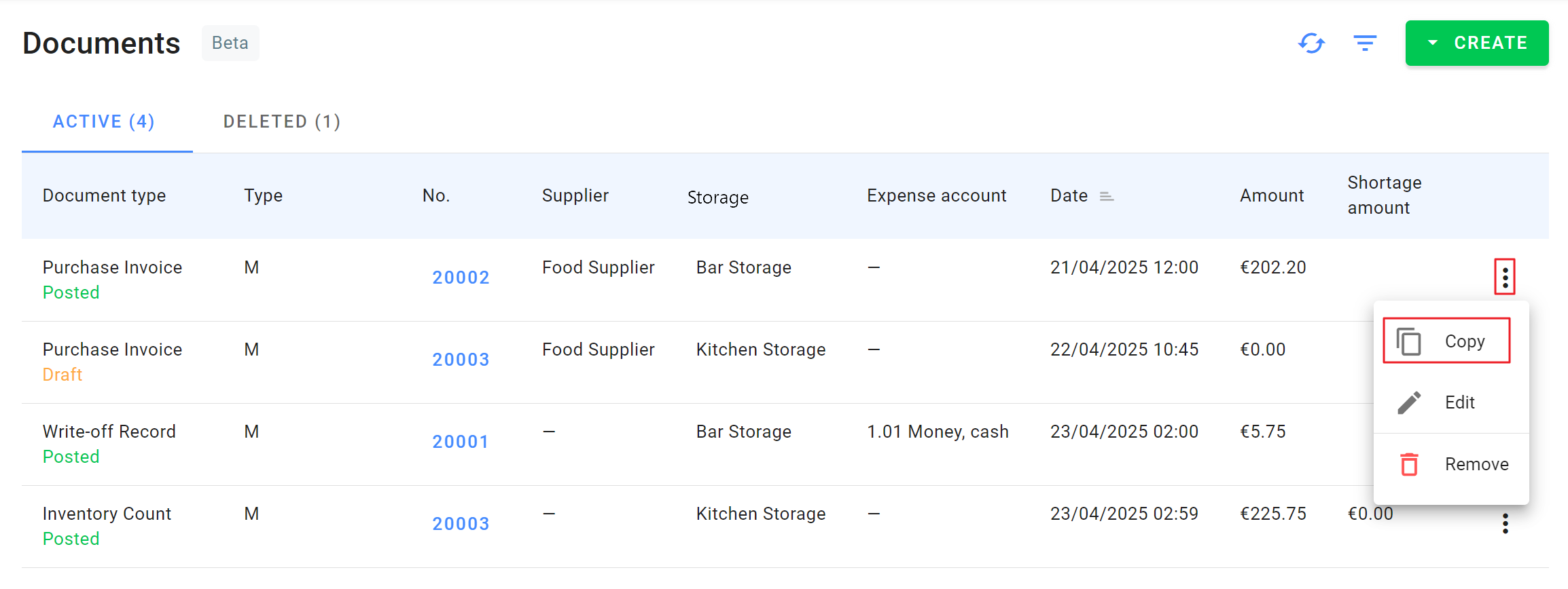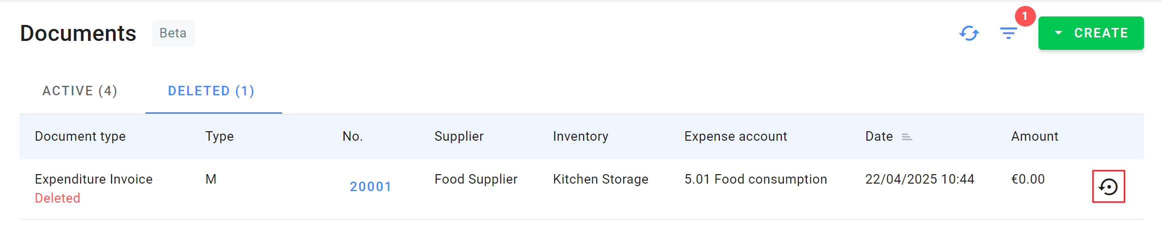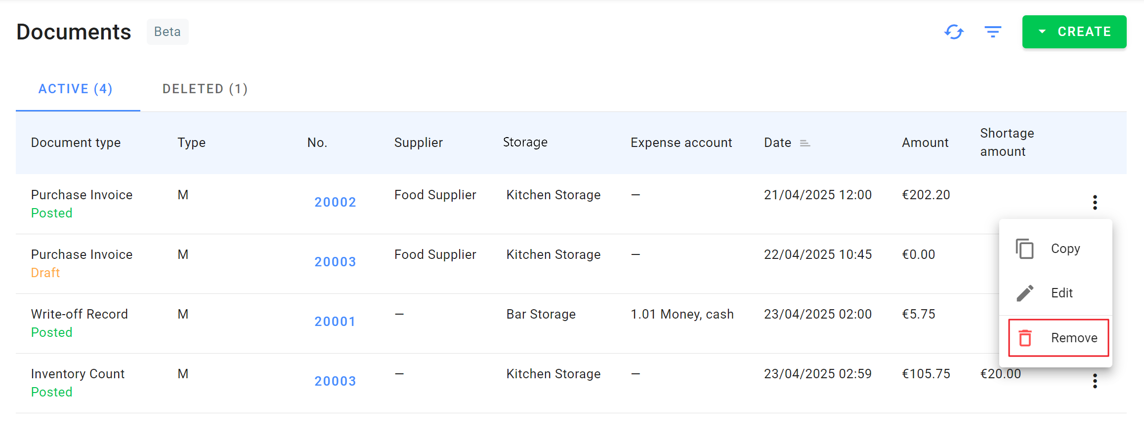 Przejdź do Codzienne operacje restauracyjne > Magazyn > Dokumenty, aby wyświetlić listę aktywnych i usuniętych dokumentów.