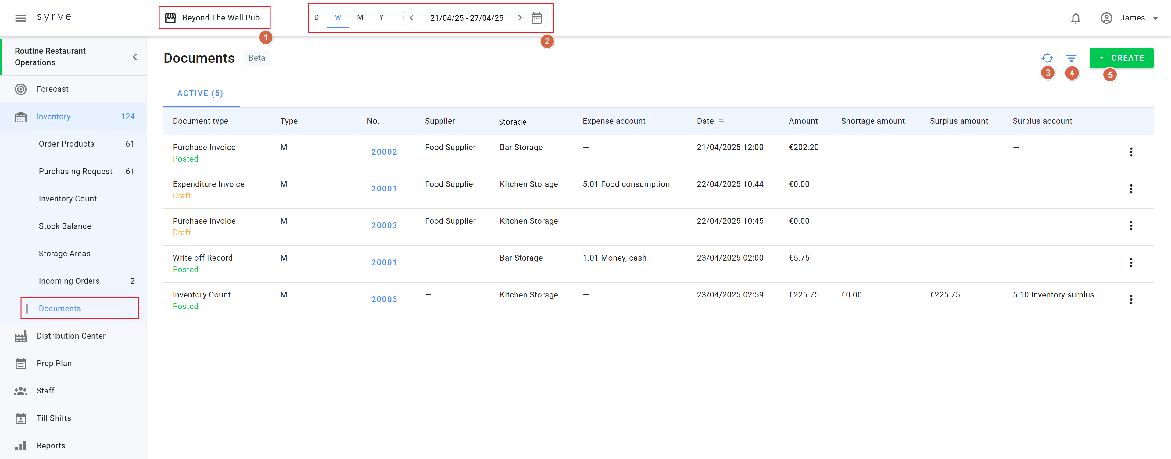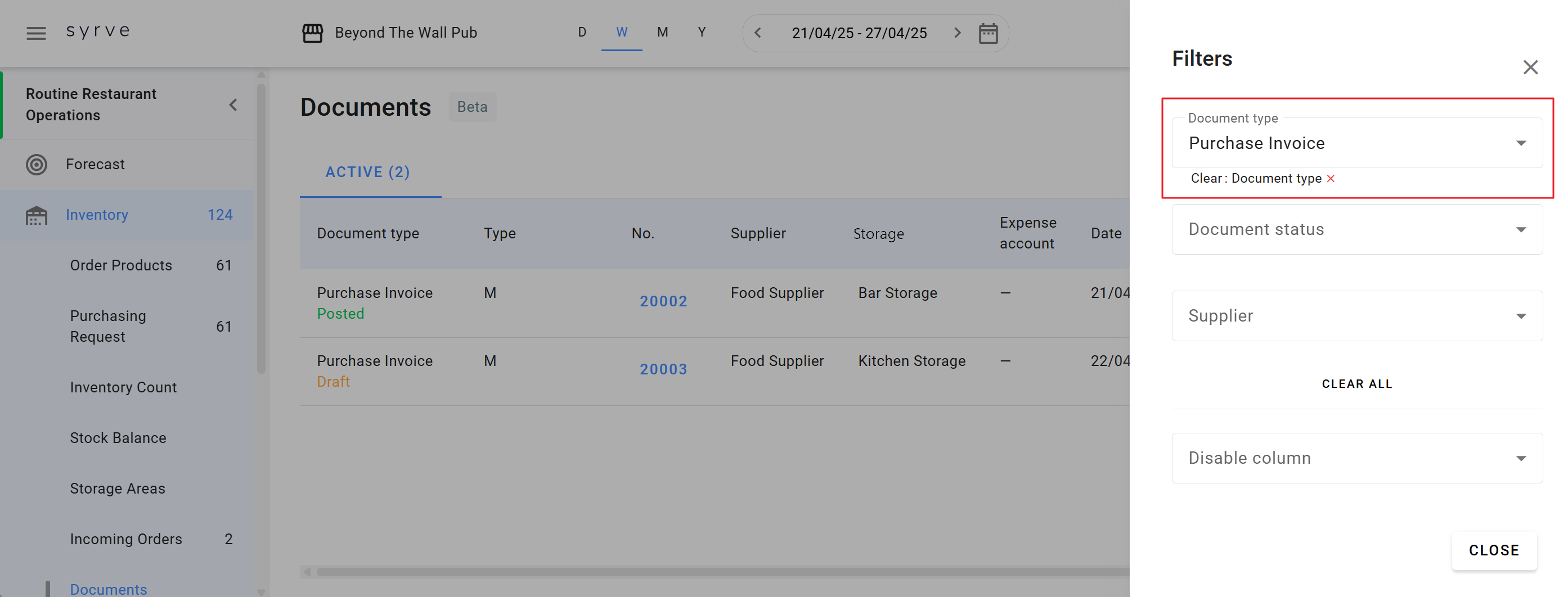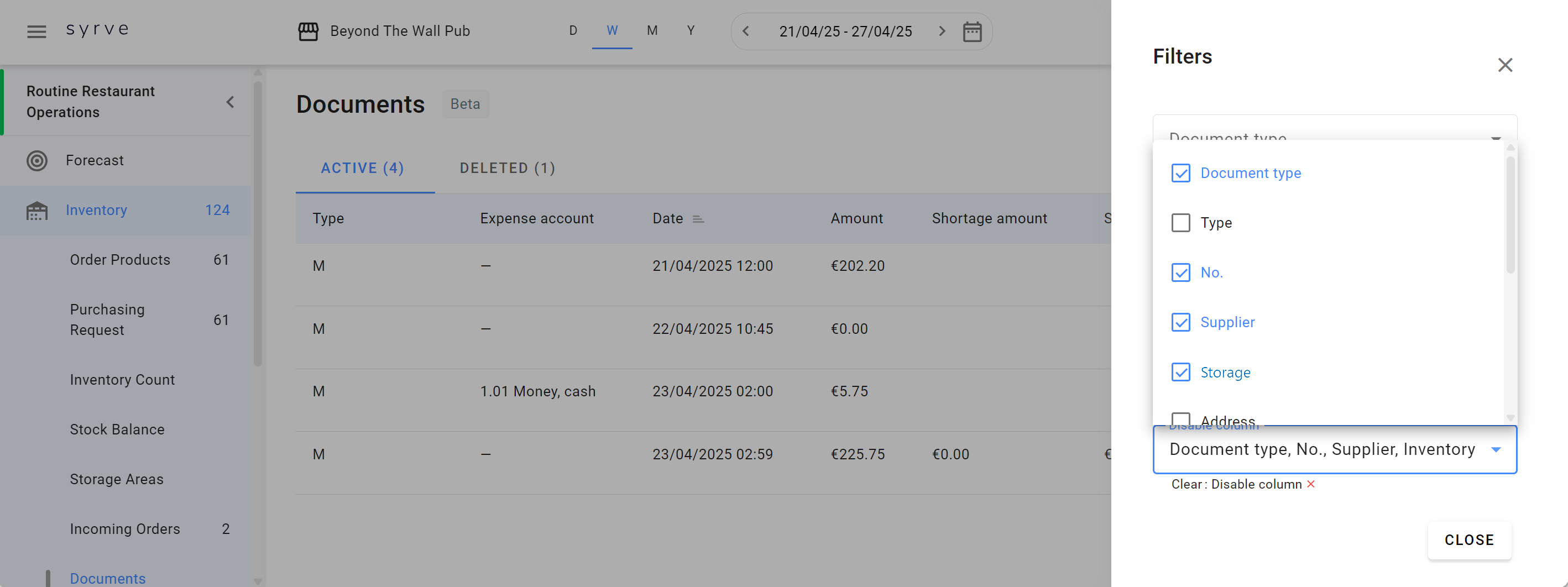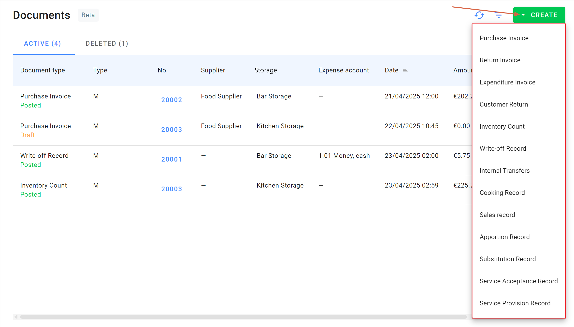 Przejdź do Codzienne operacje restauracyjne > Magazyn > Dokumenty, aby wyświetlić listę aktywnych i usuniętych dokumentów.
