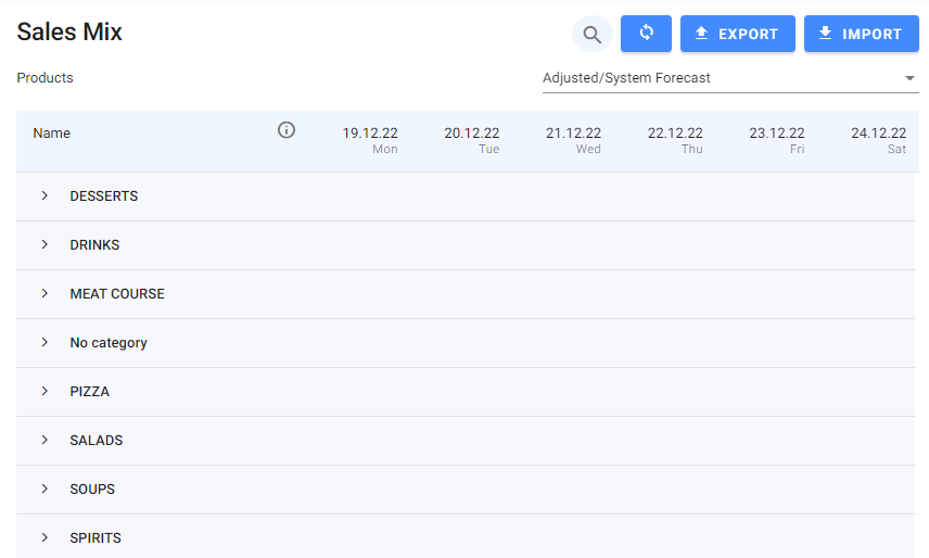 Ta sekcja pokazuje Twoją przyszłą sprzedaż podzieloną na pozycje i podzieloną na grupy. Dostępne są dwa tryby widoku: Prognoza skorygowana/systemowa oraz Prognoza skorygowana/sprzedaż rzeczywista. Pierwszy tryb służy do porównania wartości oszacowanych przez system z wartościami określonymi lub skorygowanymi przez użytkownika. Drugi tryb jest przydatny do porównania skorygowanej przyszłej sprzedaży ze sprzedażą rzeczywistą.
