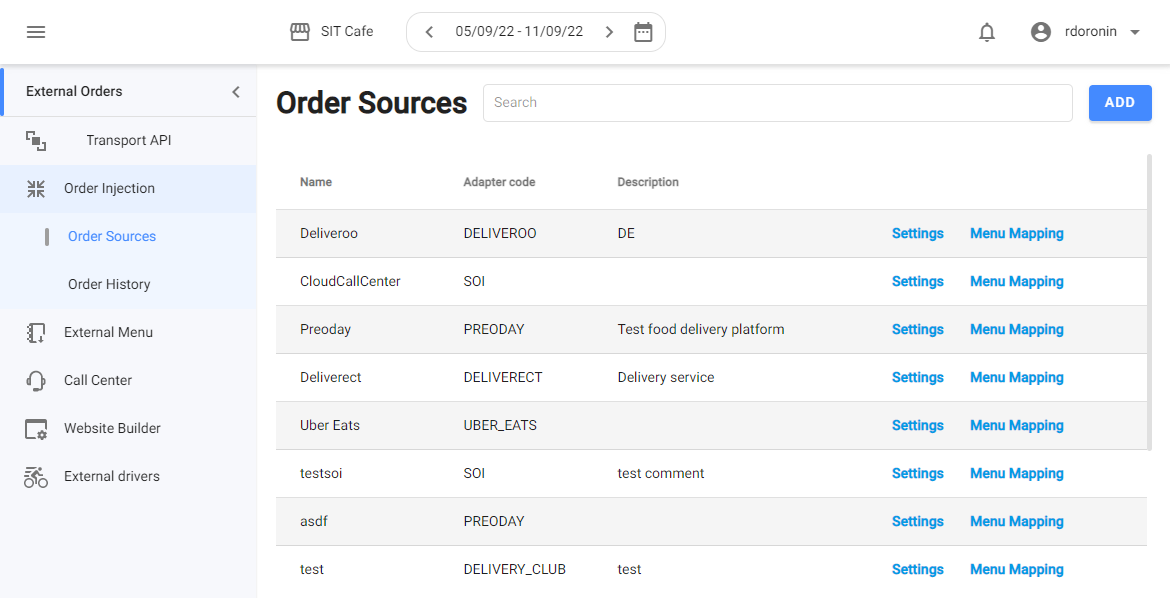 Lista zintegrowanych usług znajduje się na karcie Źródła Zamówień. Tutaj możesz sprawdzić ustawienia integracji, zaktualizować menu zgodnie z wymaganiami agregatora oraz je wyeksportować.
