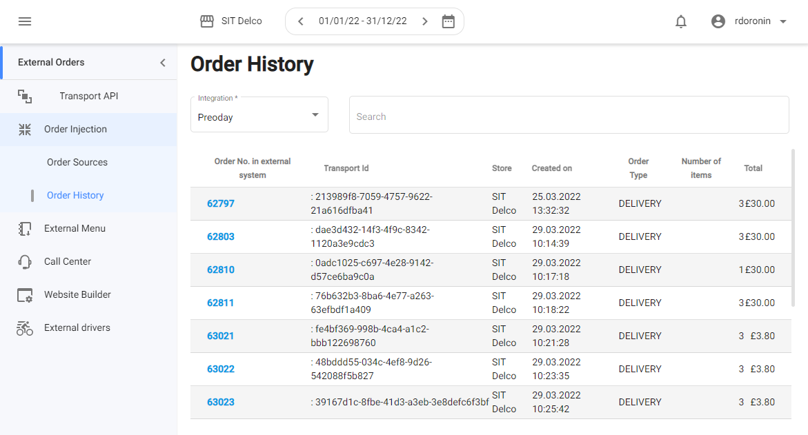 Zamówienia pochodzące z zewnętrznych źródeł pojawią się na karcie Historia Zamówień, podzielone według źródła. Tutaj możesz zobaczyć wszystkie niezbędne szczegóły zamówienia: datę, typ, liczbę pozycji, łączną kwotę, aktualny status oraz historię operacji.