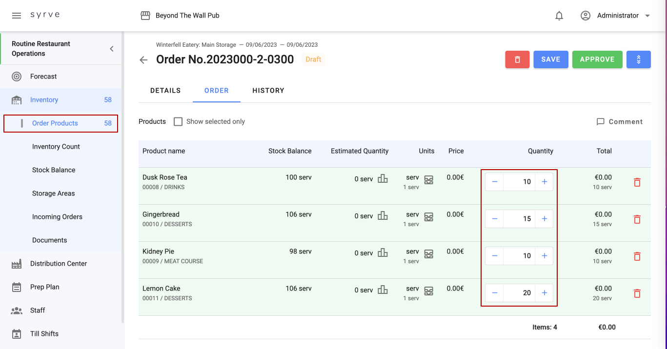 Przejdź do Operacje rutynowe restauracji > Magazyn > Zamów produkty.