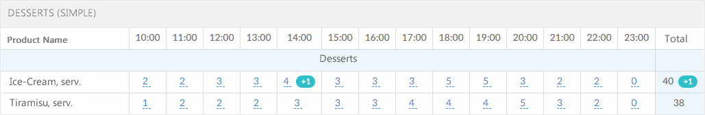 Dwa lody i jedno tiramisu muszą być gotowe do godziny 10:00. Zgodnie z planem, 3 porcje lodów mają być gotowe do godziny 14:00, ale Menedżer zdecydował, że to za mało i ręcznie zmienił liczbę na 4. Pole ma dodany znak „+1”.