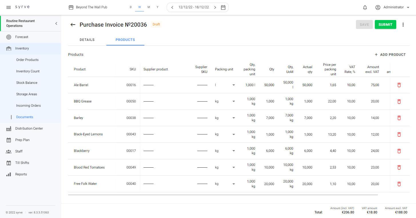 Aby zarejestrować produkty i przedmioty w magazynie, system wystawia fakturę zakupu. Użyj sekcji Dokumenty, aby sprawdzić wystawione faktury zakupu, zmienić je lub ręcznie sporządzić i złożyć nową.