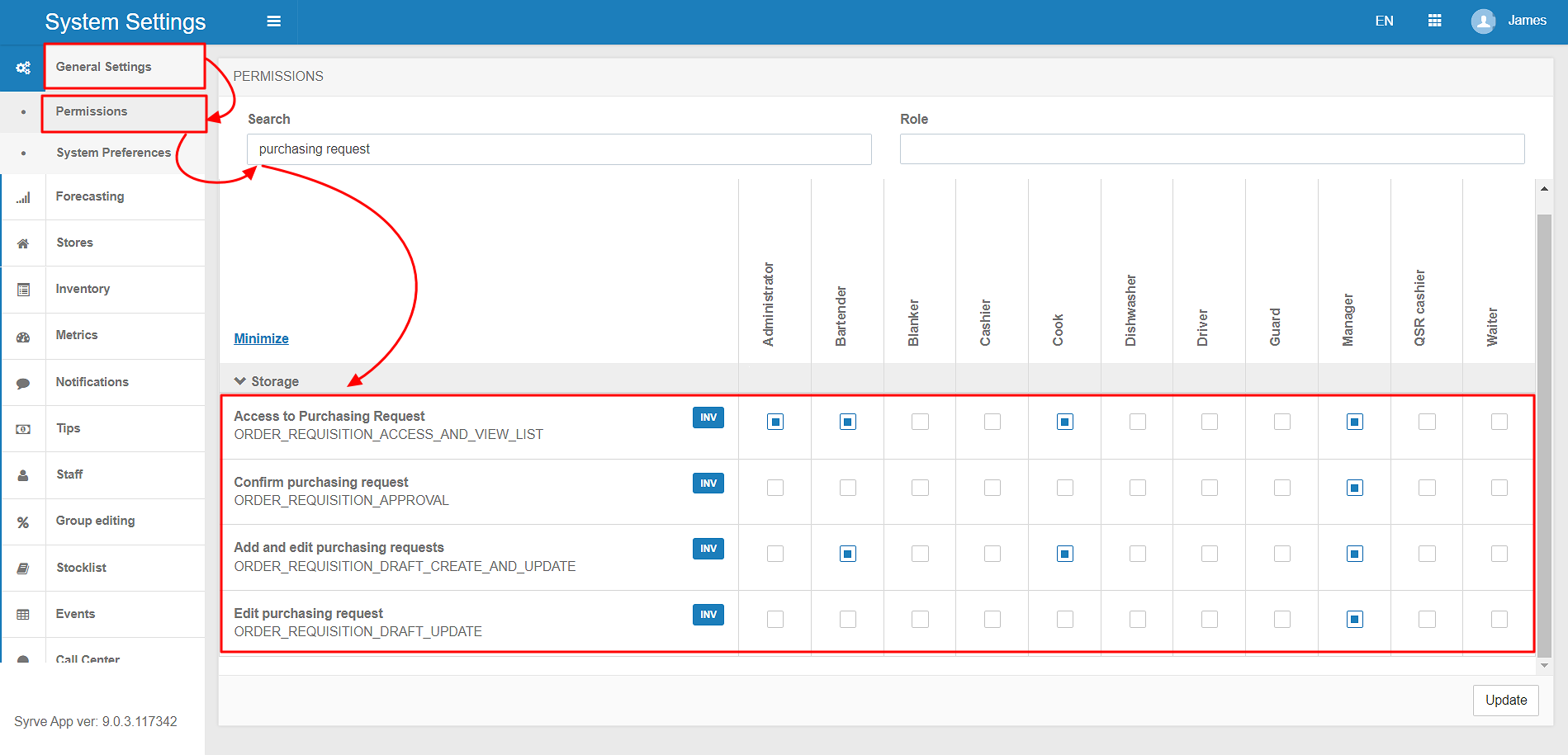 - Dostęp do Żądania Zakupowego. To uprawnienie daje dostęp do sekcji Żądanie Zakupowe w aplikacji Syrve. Zarówno personel kuchni (wypełniający żądania), jak i menedżerowie (zatwierdzający żądania) muszą mieć to uprawnienie.