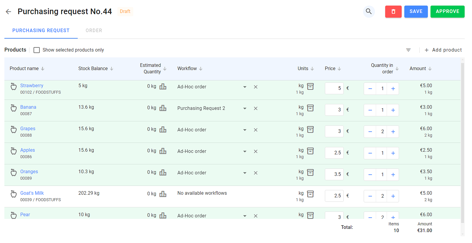 - Edytuj żądanie zakupowe. Pozwala na edycję szkiców żądań zakupowych, zmianę ilości i cen, dodawanie lub usuwanie produktów. Przyznawane menedżerom zatwierdzającym żądania zakupowe.