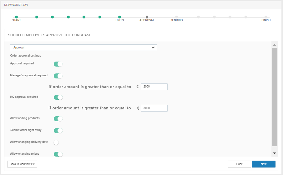 Aby uwzględnić ten etap w procesie zakupowym, włącz opcję Wymagane zatwierdzenie w bloku Ustawienia zatwierdzania w sekcji Zamówienie.