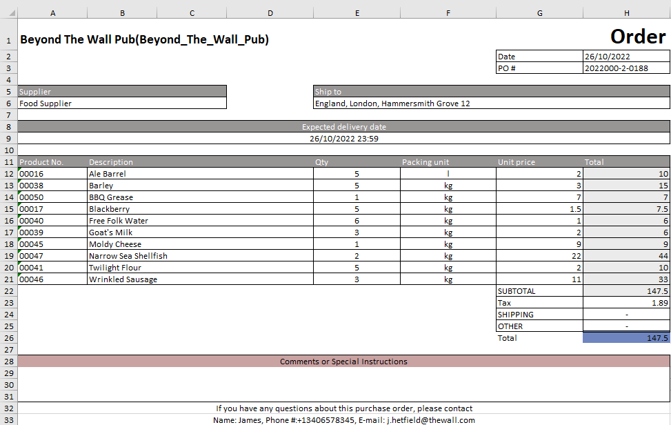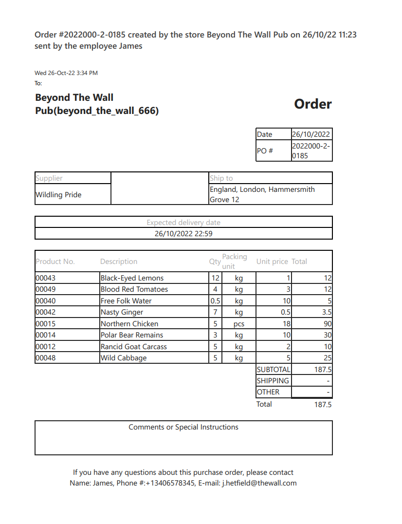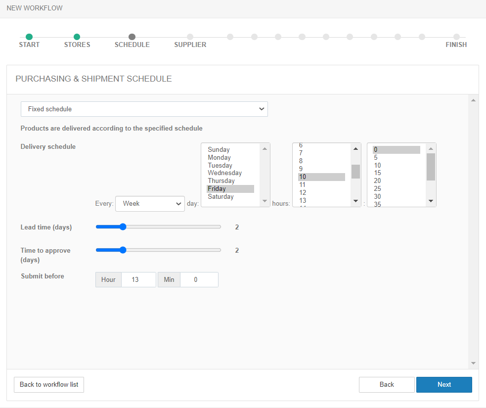 Na przykład, towary powinny być dostarczane w każdy piątek o 10:00. Restauracja ma 2 dni na sprawdzenie i zatwierdzenie zamówienia, a dostawca ma 2 dni na przygotowanie i dostawę towaru. Oznacza to, że zamówienie będzie generowane w każdy poniedziałek, a pracownik restauracji powinien je zatwierdzić przed środą do godziny 13:00 i wysłać do dostawcy.