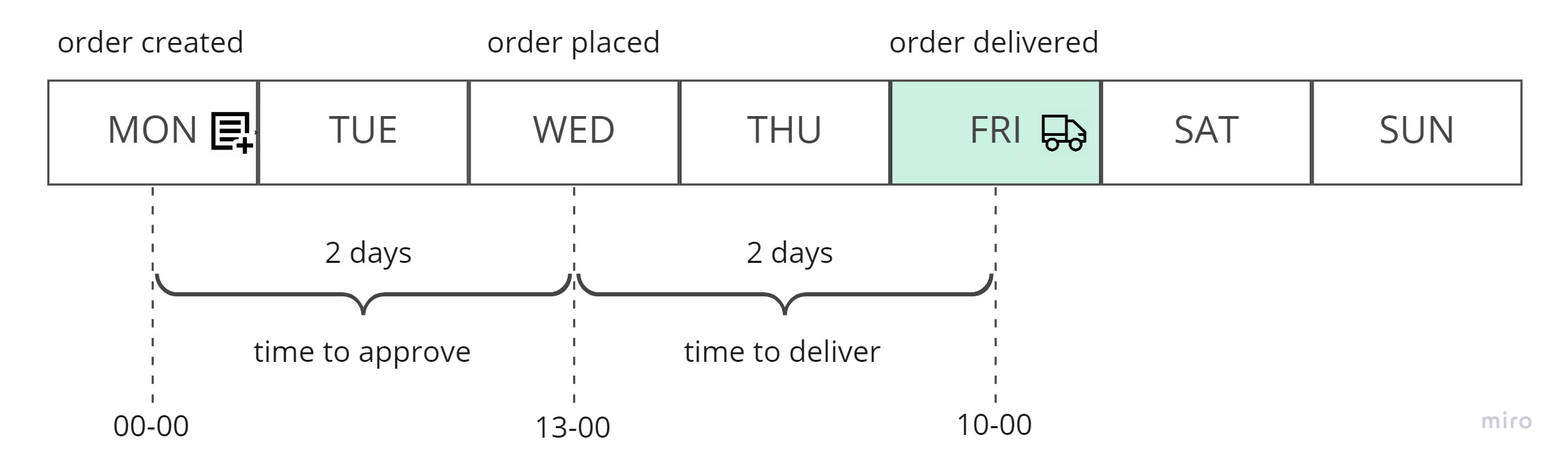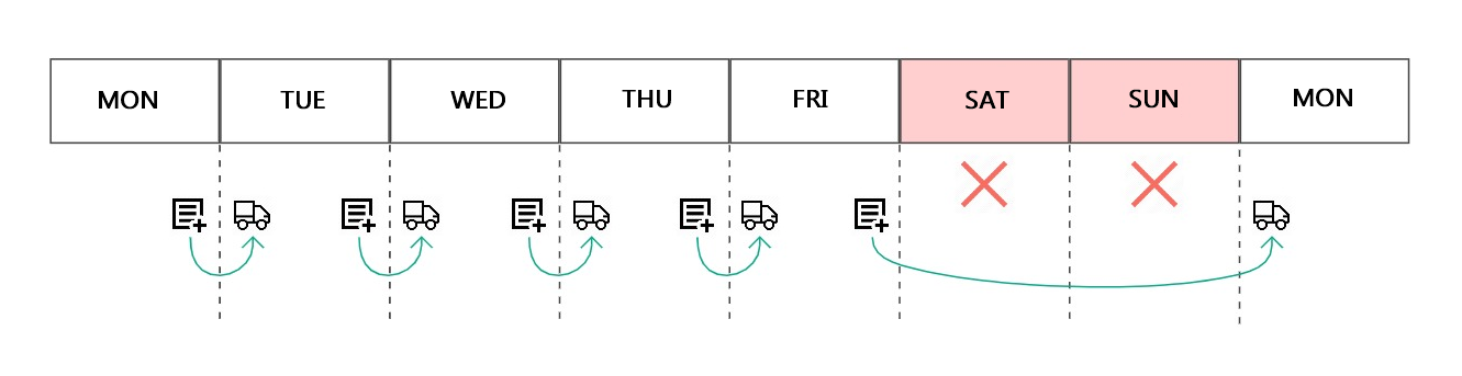 Ustawmy tygodniowy harmonogram zamówień: towary są dostarczane codziennie z wyjątkiem sobót i niedziel. Zamówienie zakupowe jest generowane codziennie, a żywność dostarczana następnego dnia. Aby mieć zamówienie dostarczone w poniedziałek, musisz je utworzyć i złożyć w piątek.
