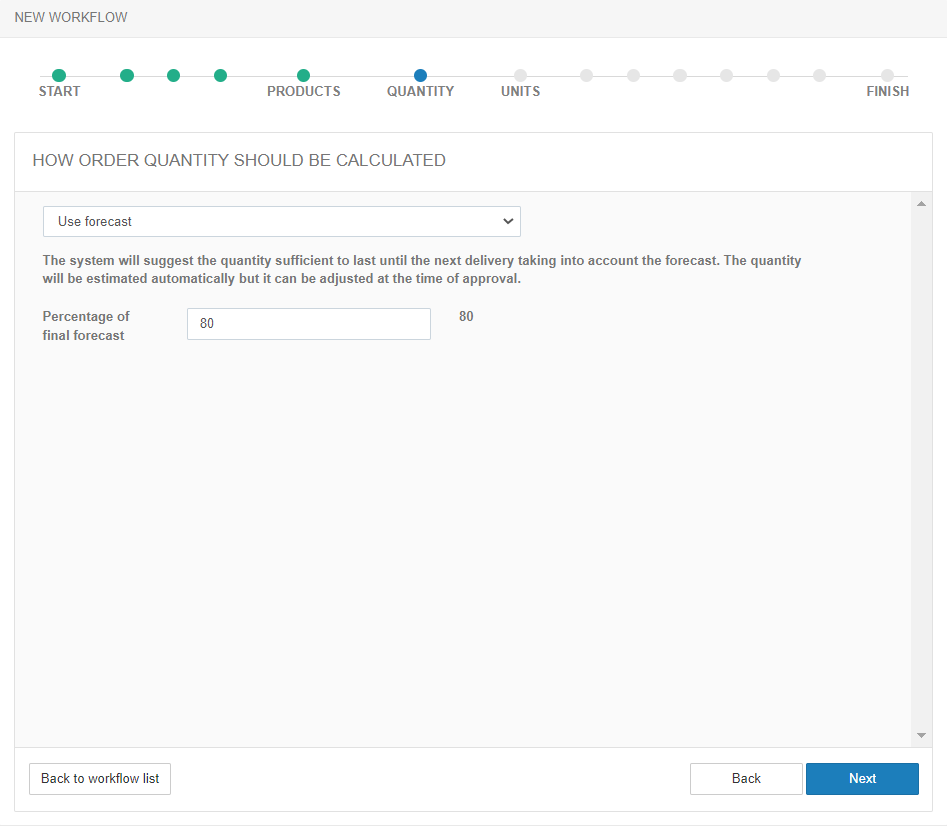 Użyj tego pola, jeśli ilość towaru jest szacowana automatycznie (patrz krok Ilość). System automatycznie oszacuje ilość produktu wystarczającą do przetrwania do następnej dostawy.