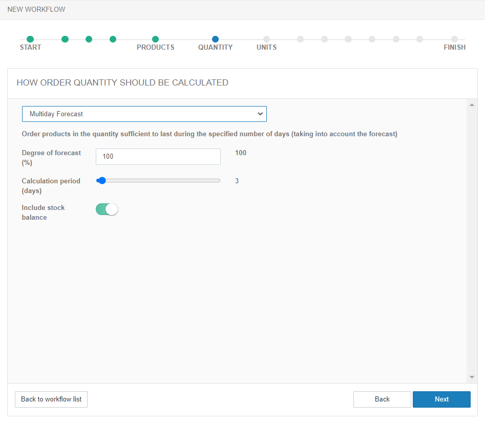 Aby zamówić wystarczającą ilość na kilka dni z uwzględnieniem produktów na stanie, użyj opcji Prognoza wielodniowa.