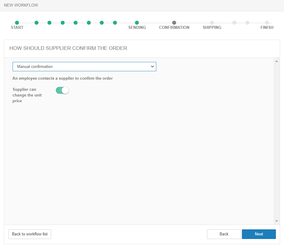 Jeśli potrzebujesz uzyskać potwierdzenie od dostawcy, wybierz Ręczne potwierdzenie. W takim przypadku pracownik restauracji kontaktuje się z dostawcą telefonicznie lub w inny sposób, aby uzgodnić ilości i produkty oraz potwierdzić zamówienie.