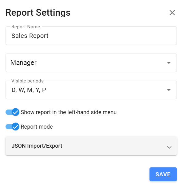 Wprowadź Nazwa raportu, zaznacz Role pracowników, którzy będą widzieć tworzony raport, wybierz Widoczne okresy oraz w razie potrzeby włącz ustawienia Pokaż raport w menu po lewej stronie oraz Tryb raportu.