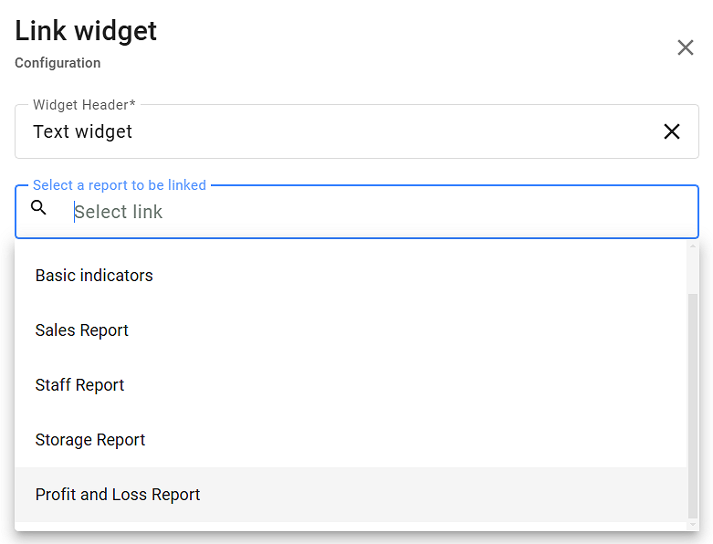 Określ Nagłówek widżetu (czyli jego nazwę) i wybierz jeden ze standardowych raportów z listy, do którego ten raport będzie powiązany. Zwróć uwagę, że nie można dodać niestandardowego linku do raportu.