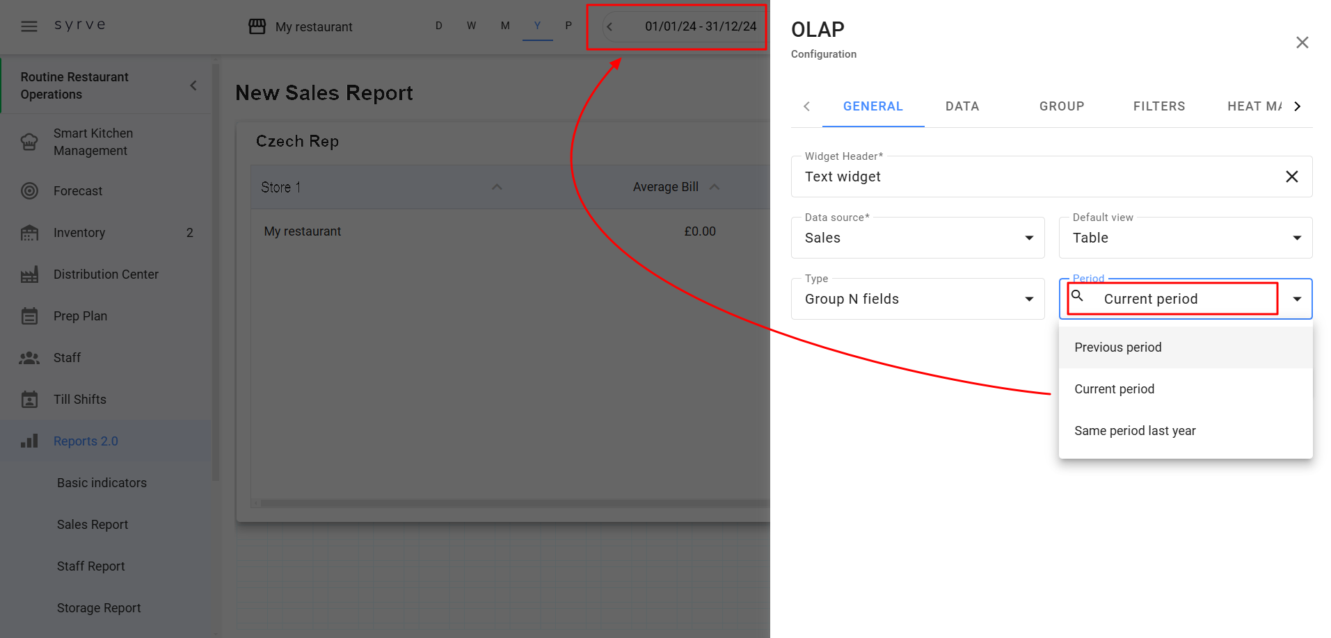 W zakładce Ogólne określ Nagłówek widżetu (czyli jego nazwę) oraz Źródło danych: Sprzedaż lub Transakcje. W polu Okres wybierz wymagany okres: Bieżący, Poprzedni lub Taki sam jak w zeszłym roku. Ustawienia okresu są ogólnymi ustawieniami dla budowy raportu.