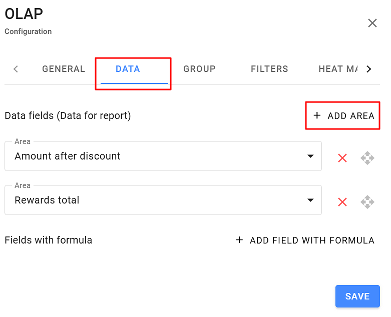 W zakładce Dane dodaj obszary, których dane mają zostać uwzględnione w raporcie. Aby dodać nowy obszar, kliknij