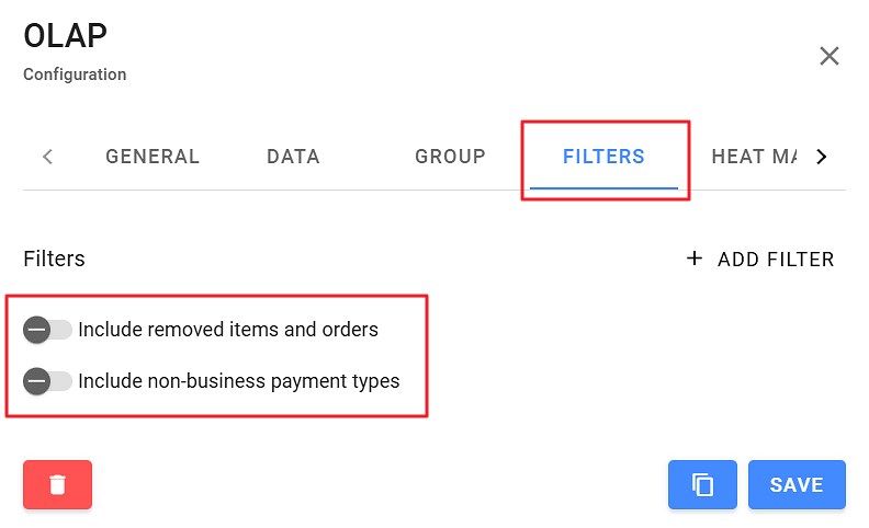 W zakładce Filtry skonfiguruj, czy uwzględniać usunięte pozycje i zamówienia oraz dane dotyczące typów płatności niebiznesowych (takich jak posiłki pracownicze) w raporcie. Domyślnie te filtry są wyłączone.