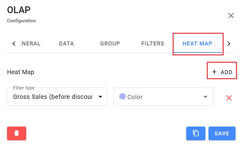 Zakładka Mapa cieplna pozwala dodać mapę cieplną dla wybranych pól. Mapa cieplna to graficzna reprezentacja danych, gdzie poszczególne wartości pól są kodowane kolorami.