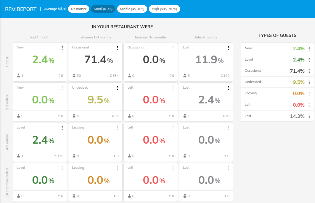 Aby zobaczyć gości z małymi średnimi rachunkami i odfiltrować innych, kliknij Mały. W ten sam sposób możesz grupować gości ze średnimi i dużymi rachunkami. Zakresy rachunków są obliczane automatycznie.