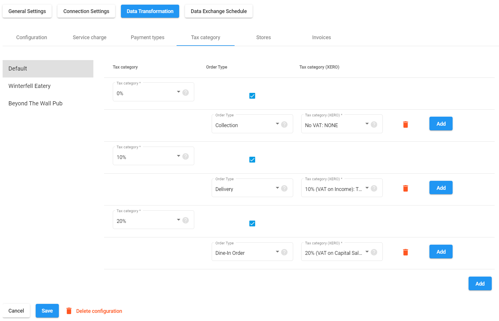 Po nawiązaniu połączenia i udzieleniu organizacjom Xero dostępu do Syrve, możesz przejść do sekcji Transformacja Danych, gdzie możesz określić podstawowe parametry swoich sklepów Syrve oraz przypisać transakcje Syrve do kont Xero.