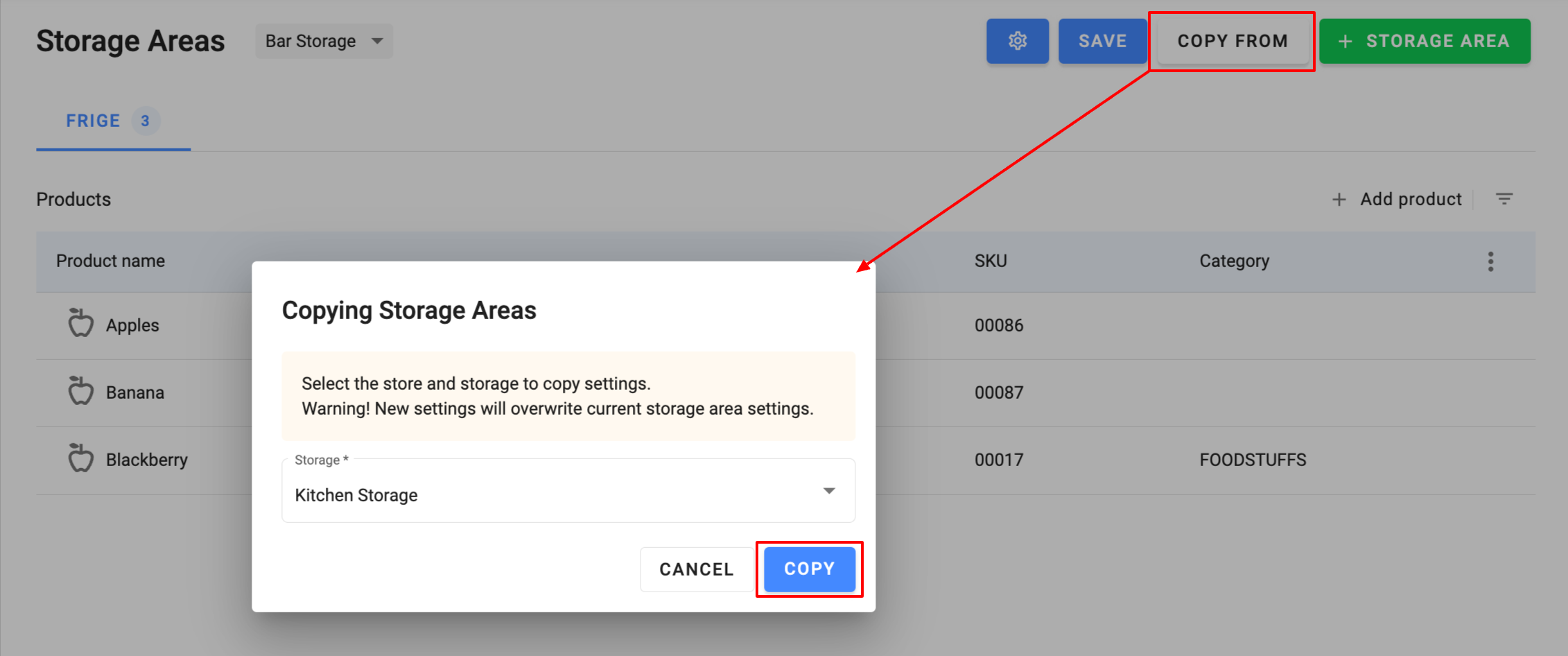Skopiowane obszary magazynowe pojawią się w aplikacji Syrve w docelowym sklepie.