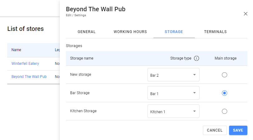 Wybierz Typ każdego magazynu. Służy on do grupowania magazynów różnych restauracji, a następnie do ustawiania procesów, które odbywają się w takich magazynach. Załóżmy, że w Twojej sieci jest więcej niż jedna restauracja, z magazynem w barze. Możesz wybrać typ Bar 1 dla każdego takiego magazynu i określić go w ustawieniach inwentaryzacji. W takim przypadku inwentaryzacja będzie przeprowadzana we wszystkich barach Twojej sieci. Kilka magazynów jednej restauracji nie może mieć tego samego typu.