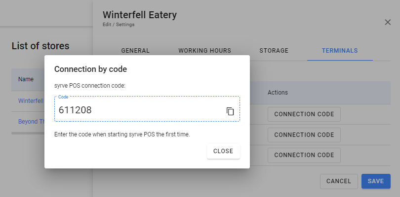 Aby to zrobić, kliknij przycisk Kod połączenia naprzeciwko swojego terminala POS. Skopiuj kod i wklej go do POS.