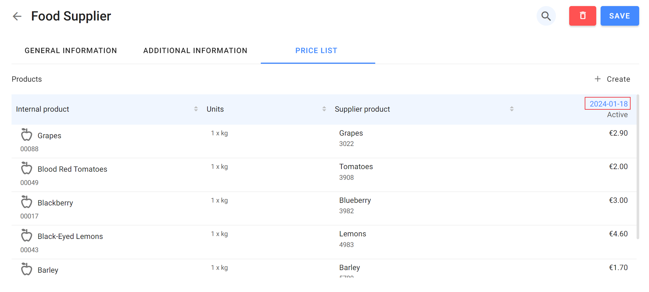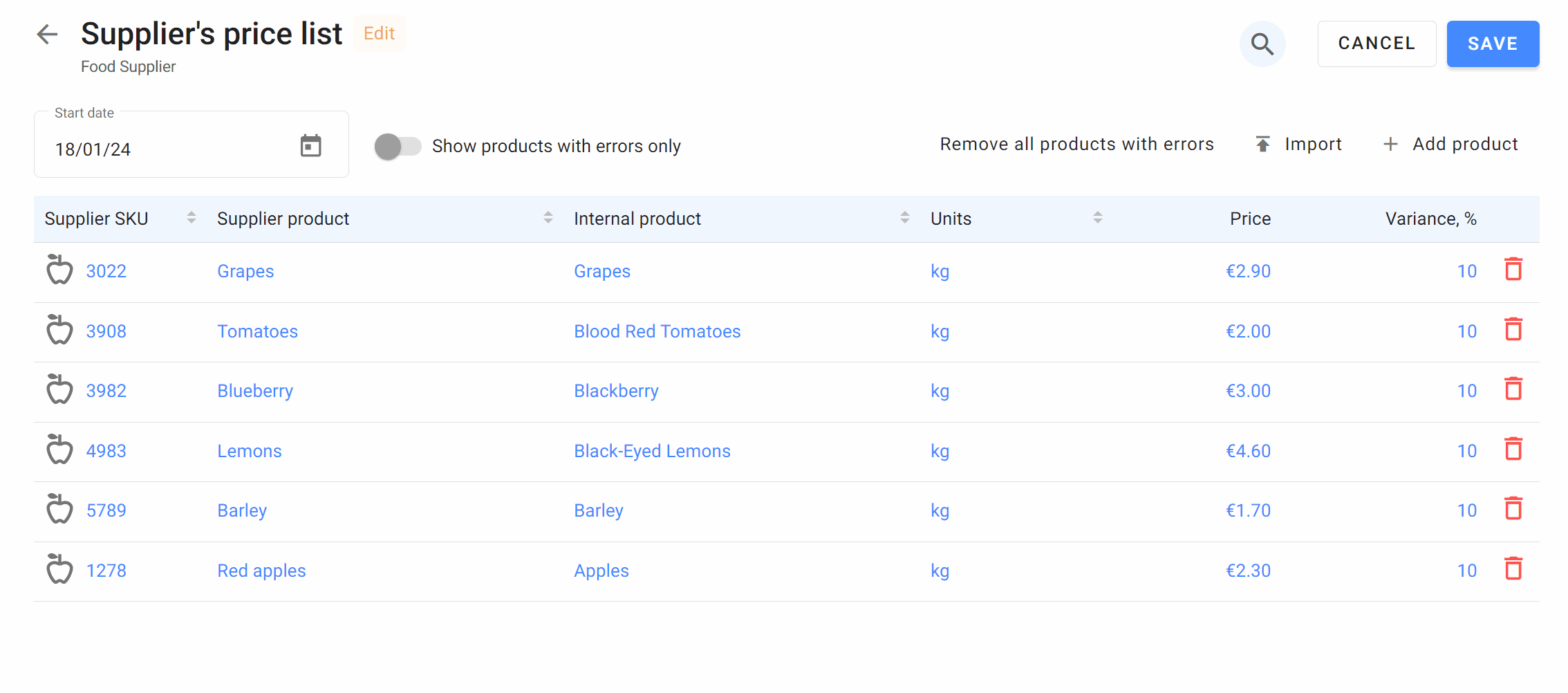 Na podstawie cennika dostawcy możesz utworzyć listę towarów, którą możesz wykorzystać do zamawiania żywności w procesach zakupowych. Dzięki temu łatwo określisz, jakie towary zamówić i od którego dostawcy, jakie jednostki opakowań są używane oraz jaka jest cena.