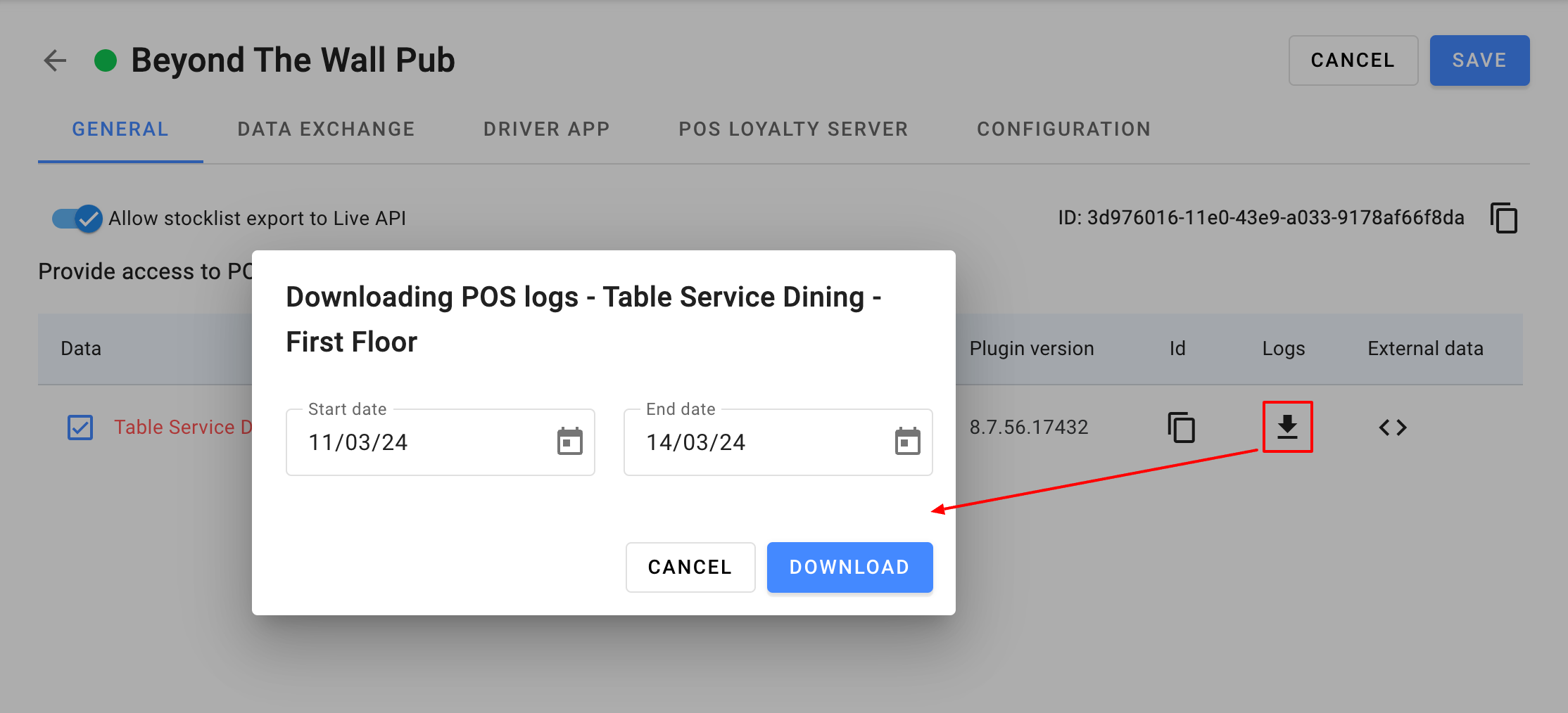 Aby sprawdzić szczegóły działania na głównym terminalu POS lub ustalić, co powoduje błędy wtyczki Syrve Live (jeśli występują), kliknij przycisk Pobierz logi POS.