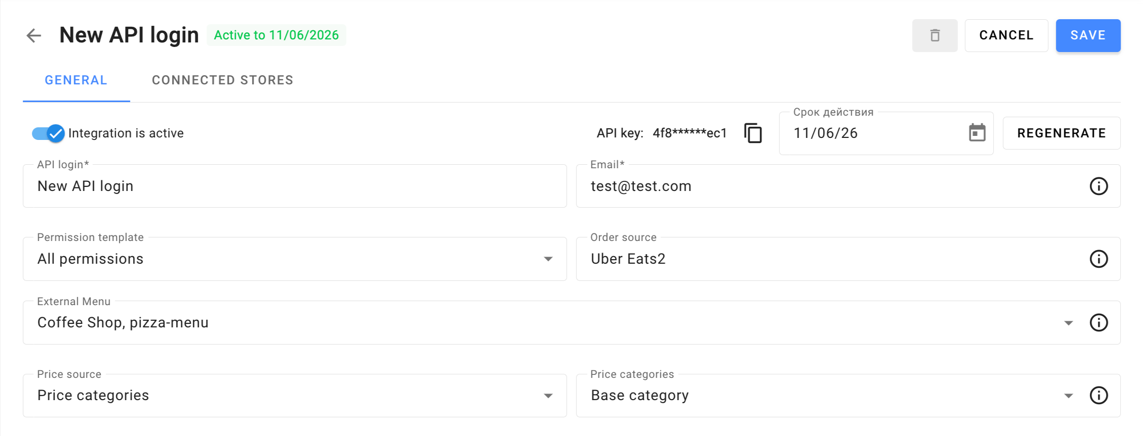 W wersjach Syrve 8.9 i wyższych klucz API zawiera 32 znaki i ma datę wygaśnięcia. Aby zaktualizować wcześniej utworzony klucz, kliknij Regeneruj, a klucz zostanie automatycznie przedłużony o dwa lata od bieżącej daty. Dla wszystkich nowych kluczy API data wygaśnięcia jest wyświetlana na liście integracji.