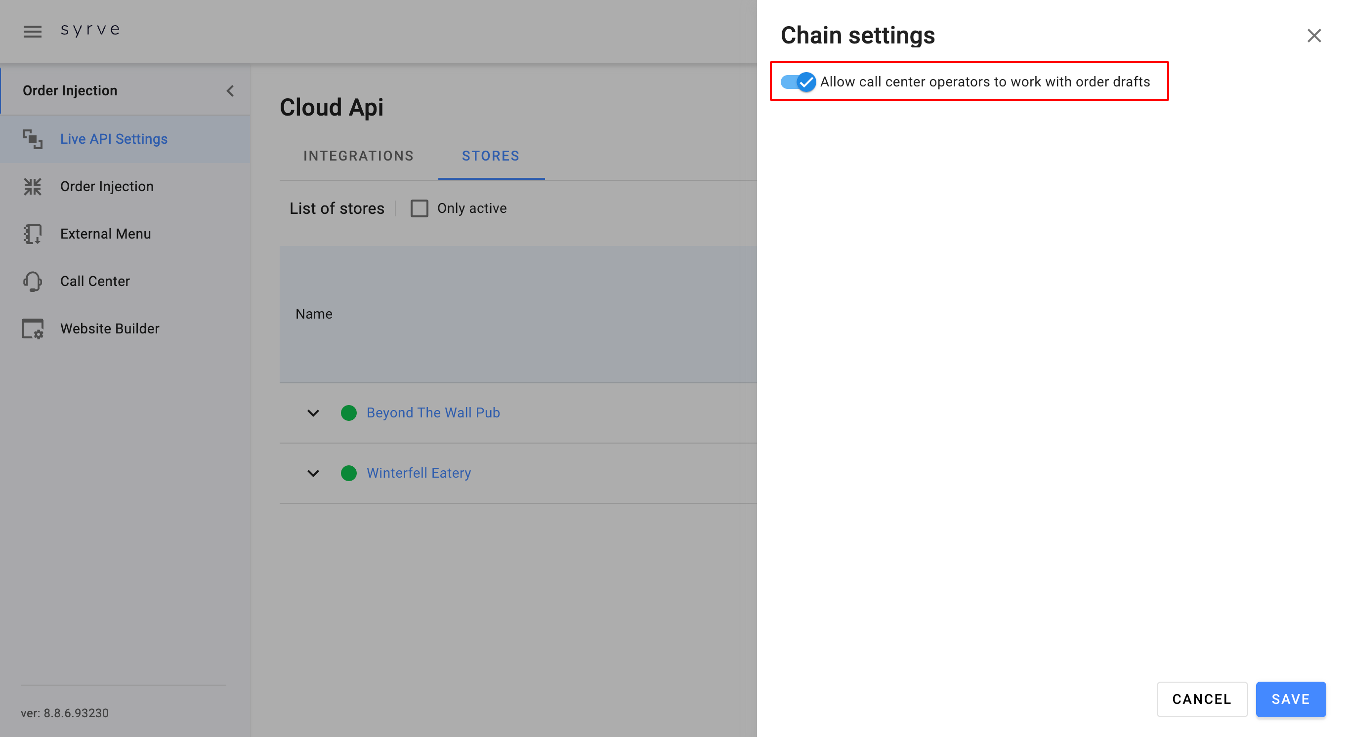 Po utworzeniu integracji upewnij się, że usługa Syrve Live jest włączona: